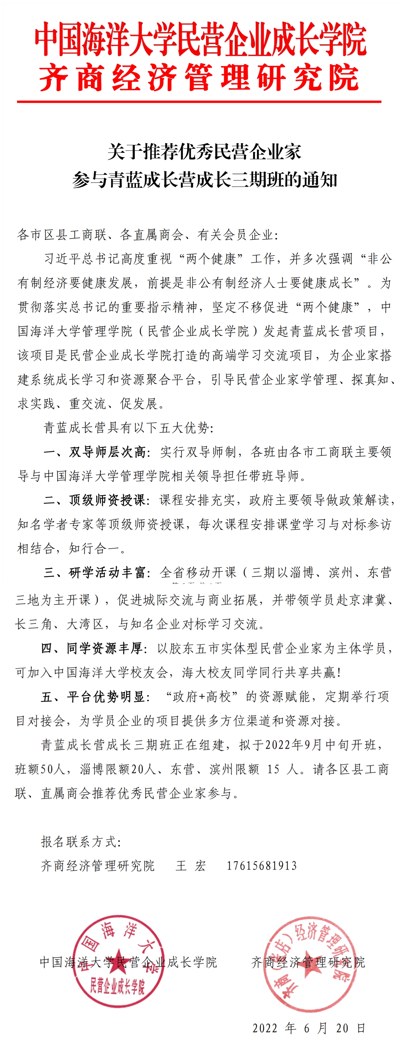 关于推荐优秀民营企业家参与青蓝成长营成长三期班(淄博)的通知